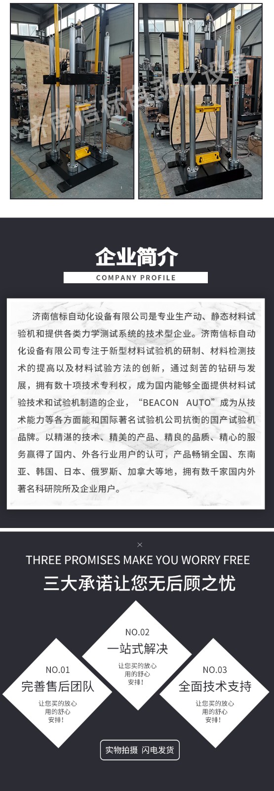 濟南信標自動化設備有限公司主要生產:動靜態萬能疲勞試驗機,接骨板彎曲試驗機,縫合線拉伸疲勞試驗機,髖膝關節磨損試驗機,電子萬能試驗機、液壓萬能試驗機、巖石三軸、四軸,電液拉力試驗機,材料試驗機,高低溫蠕變,高低頻疲勞,拉伸、扭轉、杯突等二十多個系列兩千多個的品種。