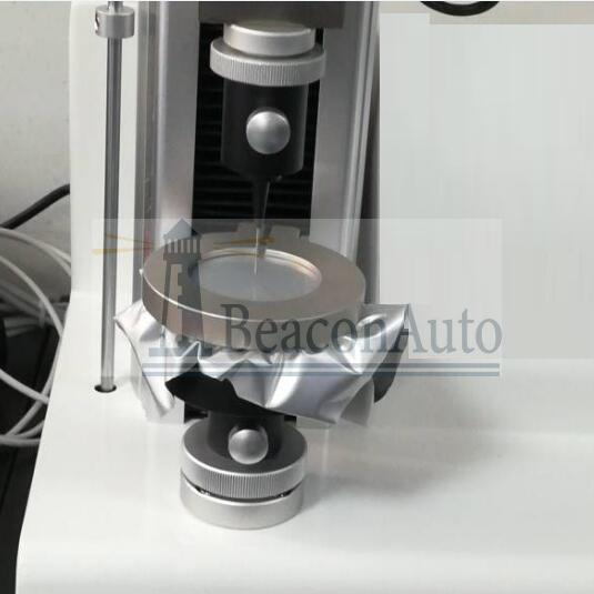 將直徑為100mm的試片安裝在樣膜固定夾環(huán)上,然后用直徑為1.0mm,球形頂端半徑為0.5mm的鋼針,以(50±5)mm/min的速度去頂刺,讀取鋼針穿透試片的大負荷,測試片數(shù)5個以上,取其平均值。